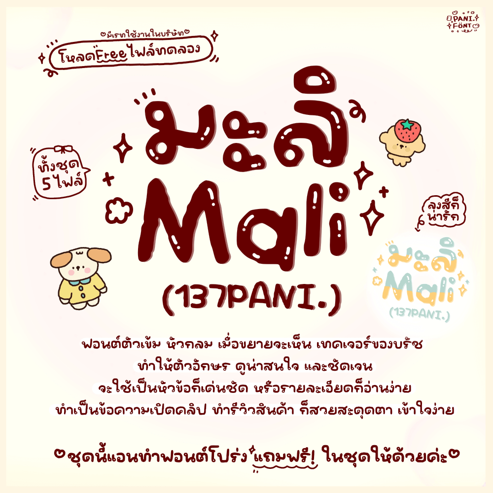 ฟอนต์ 137PANI.มะลิ – ฟอนต์ตัวเข้ม หัวกลม เมื่อขยายจะเห็น เท็กซ์เจอร์ของบรัช ทำให้ตัวอักษร ดูน่าสนใจ และชัดเจน
