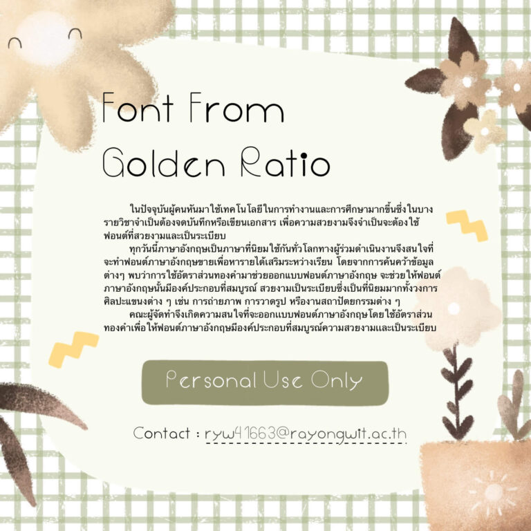 Golden Ratio 19 Jan 2024 ฟอนต์นี้สร้างเพื่อจัดทำโครงงานคณิตศาสตร์ รองรับเฉพาะภาษาอังกฤษ ตัวเลข และอักขระพิเศษบางตัว ขอบคุณสำหรับพื้นที่นะคะ