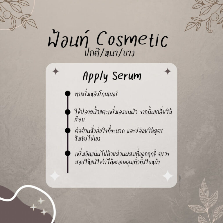 แรงบันดาลใจในการออกแบบ Serum : เป็นฟอนต์คลาสสิกที่มีความเป็นลายมือปนอยู่หน่อยๆ เหมาะกับการทำสไลด์ อธิบายสินค้าต่างๆ หรือพรรณนาเนื้อหายาวๆ เพราะอ่านง่ายเหมือนฟอนต์ทางการฉบับลายมือ และสระไม่ลอยทุกโปรแกรม