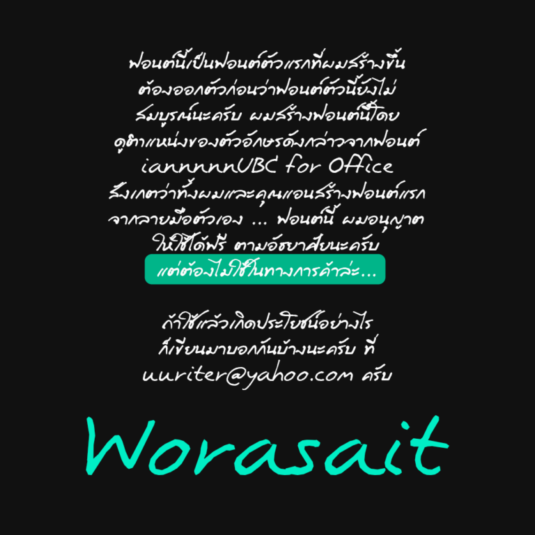 ฟอนต์นี้เป็นฟอนต์ตัวแรกที่ผมสร้างขึ้น ต้องออกตัวก่อนว่าฟอนต์ตัวนี้ยังไม่สมบูรณ์นะครับ ผมสร้างฟอนต์นี้โดยดูตำแหน่งของตัวอักษรดังกล่าวจากฟอนต์ iannnnnUBC for Office สังเกตว่าทั้งผมและคุณแอนสร้างฟอนต์แรก จากลายมือตัวเอง