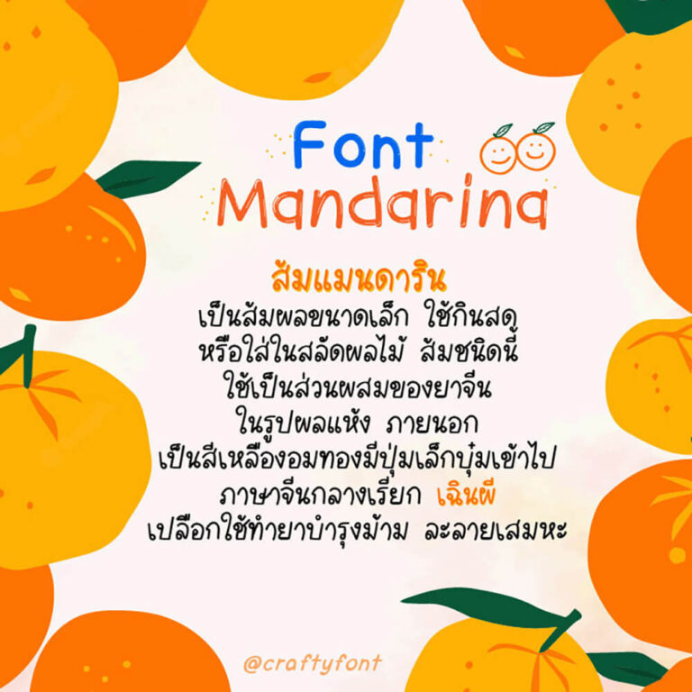 ฟอนต์ส้มแมนดาริน ผลไม้ขนาดเล็กมีรสเปรี้ยวหวาน กินแล้วสดชื่น ตัวฟอนต์ออกแบบให้มีความเอนเล็กน้อย แฟมิลี่ชุดนี้มีทั้งหมด 6 ตัวด้วยกัน ตัวหนา ตัวบาง ตัวปกติ และตัวเอนของแต่ละขนาด ฝากไว้ในอ้อมอกอ้อมใจพี่จ๋าด้วยนะจ๊ะ