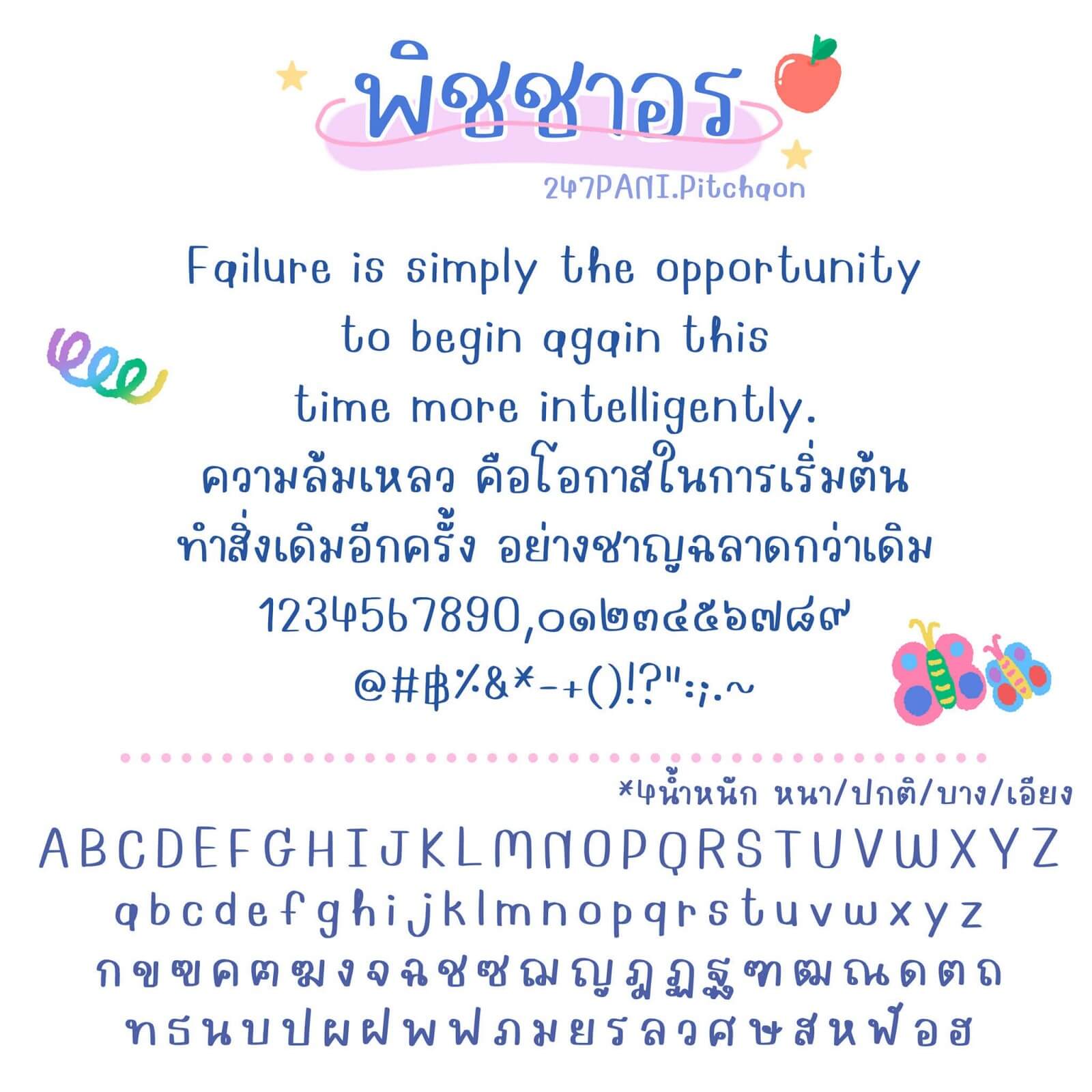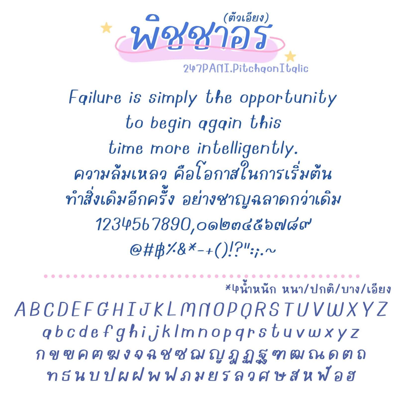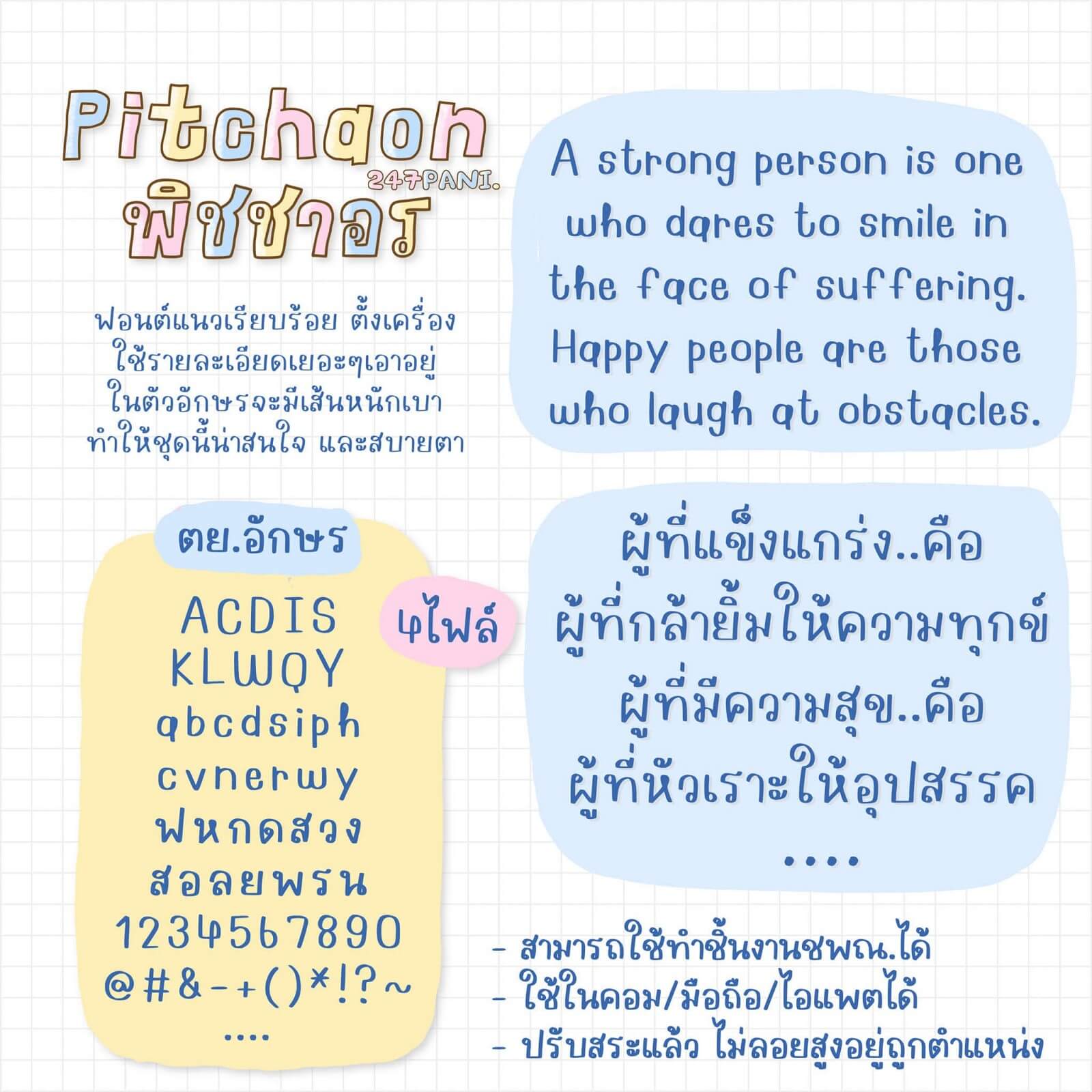 ฟอนต์ 247PANI.พิชชาอร – ฟอนต์แนวเรียบร้อย ตั้งเป็นฟอนต์เครื่อง จดรายละเอียดเยอะๆ เอาอยู่ ทรงกึ่งทางการ ในตัวอักษรจะมีเส้นหนักเบา ทำให้ชุดนี้ ดูน่าสนใจ และสบายตา