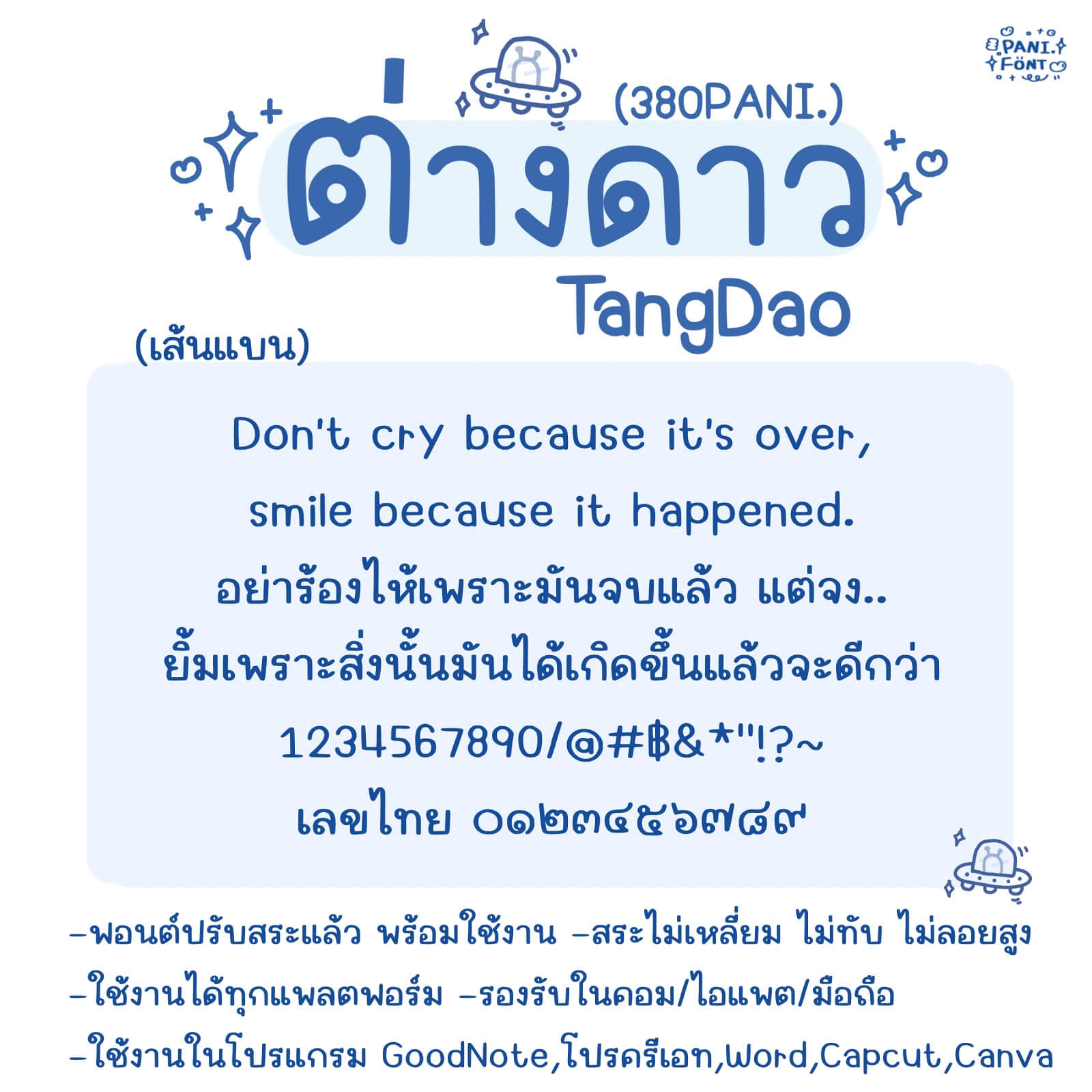 ฟอนต์ 380PANI.ต่างดาว – ฟอนต์แนวเรียบร้อย กึ่งทางการ แต่ยังคงมีความเป็นฟอนต์ลายมือ แอนทำเส้นแบน เพิ่มอีกไฟล์ในชุดให้ด้วยค่ะ