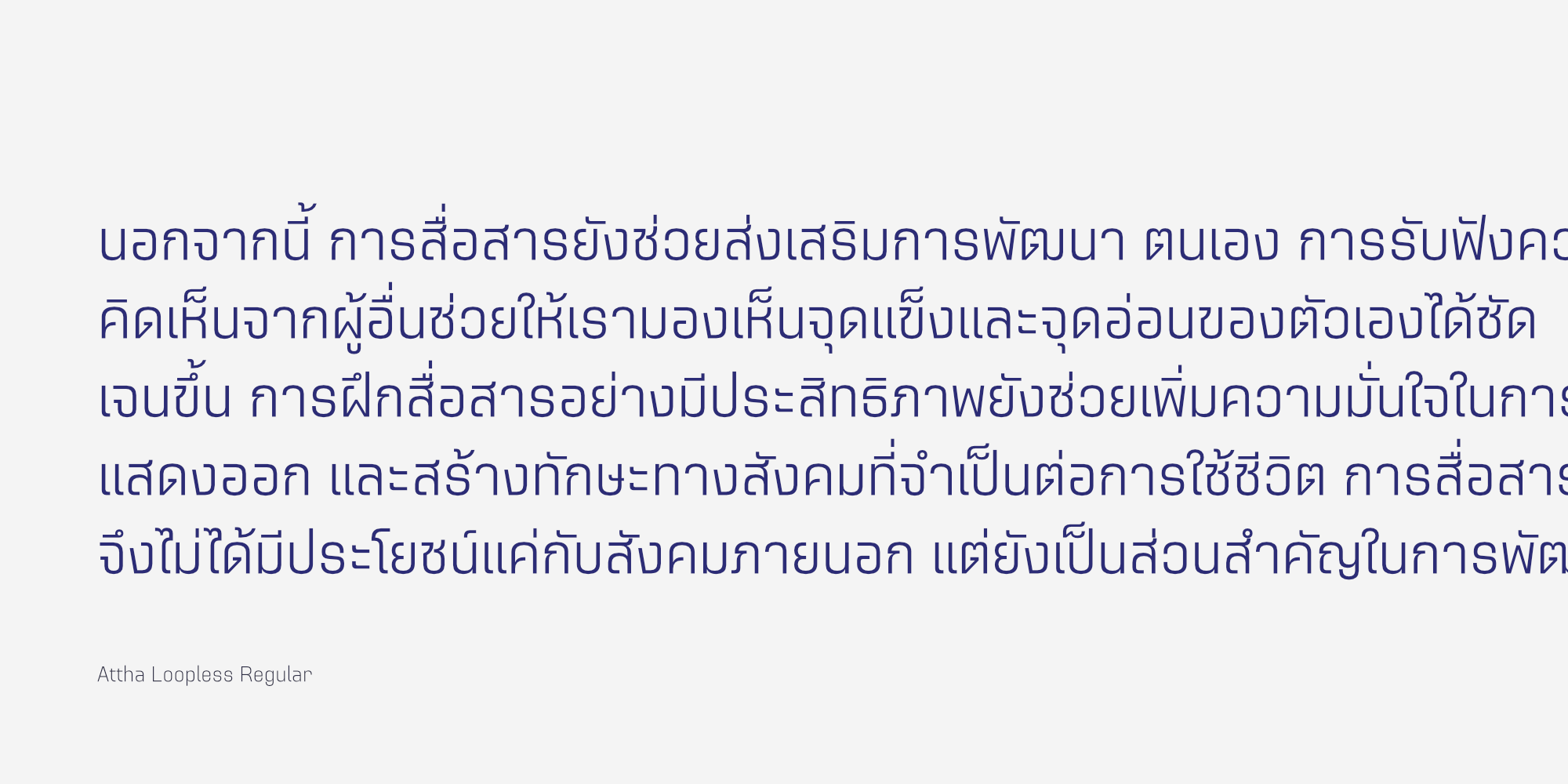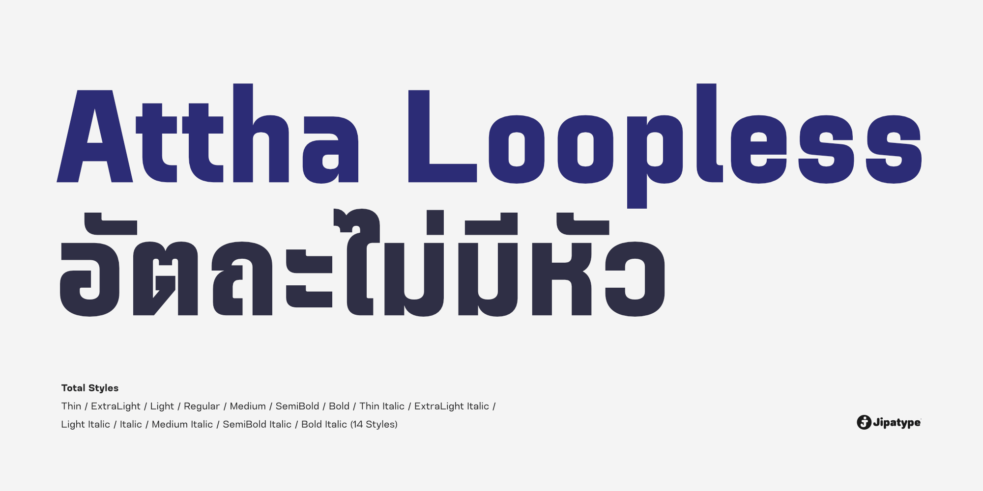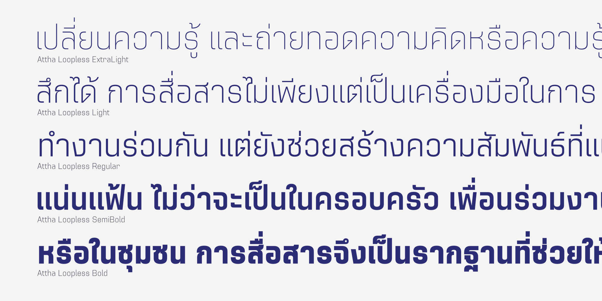 Attha Loopless เป็นชุดตัวอักษร Sans-serif สไตล์โมเดิร์นที่ถูกพัฒนาต่อยอดขึ้นจาก อัตถะ | Attha โดยปรับเปลี่ยนให้เป็นอักษรไทยแบบ “ไม่มีหัว” ทำให้มีรูปลักษณ์ที่โดดเด่นและเป็นสากลยิ่งขึ้น