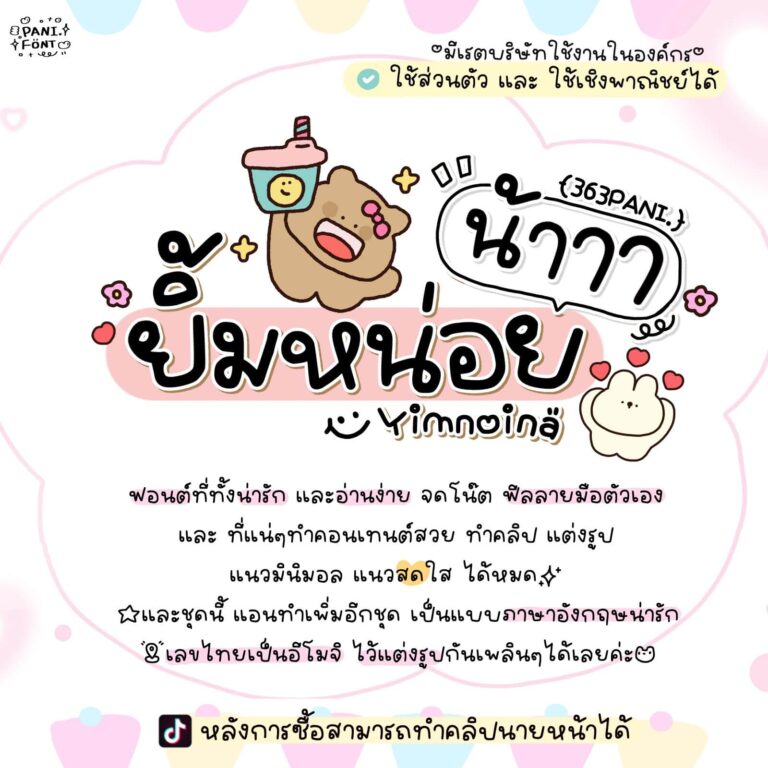 ฟอนต์ 363PANI.ยิ้มหน่อยน้าาา – ตอนเขียนฟอนต์นี้อยากได้ เป็นฟีลคำคม คำใจ เส้นบาง สบายตา แบบอยากได้ฟีลเขียนเอง ตัวไม่เท่ากัน ไม่เรียบร้อย แต่ต้องอ่านง่ายและต้องน่ารัก – ฟอนต์นี้ทำคอนเทนต์สวย ทำคลิป แต่งรูปแนวมินิมัล แนวสดใส ได้หมด