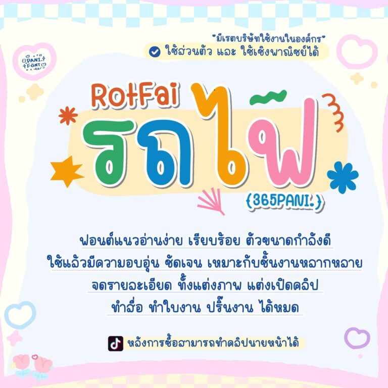 ฟอนต์ 365PANI.รถไฟ – ฟอนต์แนวอ่านง่าย เรียบร้อย ตัวขนาดกำลังดี ใช้แล้วมีความอบอุ่น ชัดเจน เหมาะกับชิ้นงานหลากหลาย จดรายละเอียด ทั้งแต่งภาพ แต่งเปิดคลิป ทำสื่อ ทำใบงาน พรินต์งาน สวย ครบ จบเลยค่ะ^^