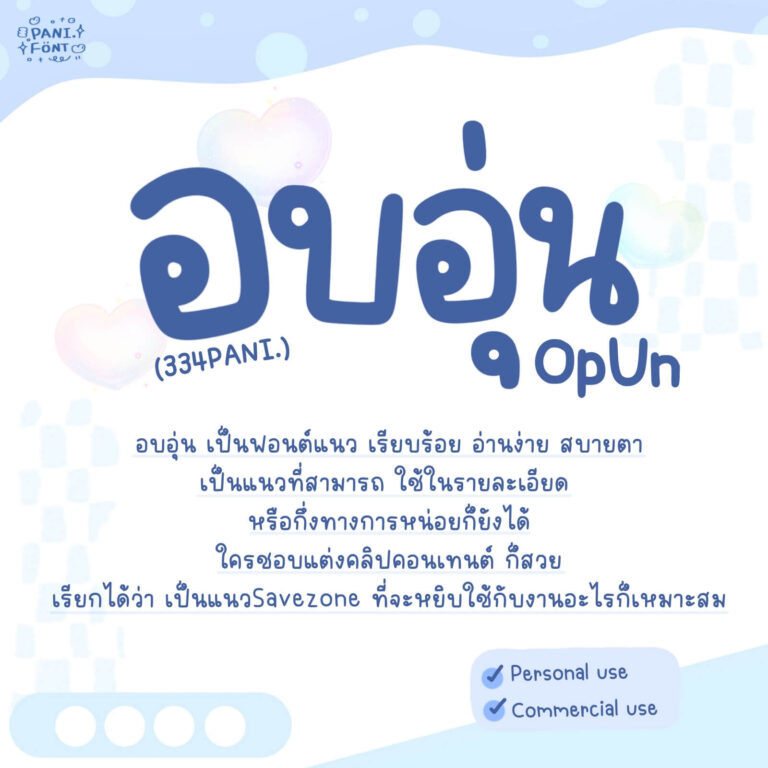 ฟอนต์ 334PANI.อบอุ่น – โหลดทดลองใช้ฟรีตัว Demo อบอุ่น เป็นฟอนต์แนว เรียบร้อย อ่านง่าย สบายตา เป็นแนวที่สามารถใช้ในรายละเอียดหรือกึ่งทางการหน่อยก็ยังได้ ใครชอบแต่งคลิปคอนเทนต์ ก็สวย เรียกได้ว่าเป็นแนว Save zone ที่จะหยิบใช้กับงานอะไรก็เหมาะสม