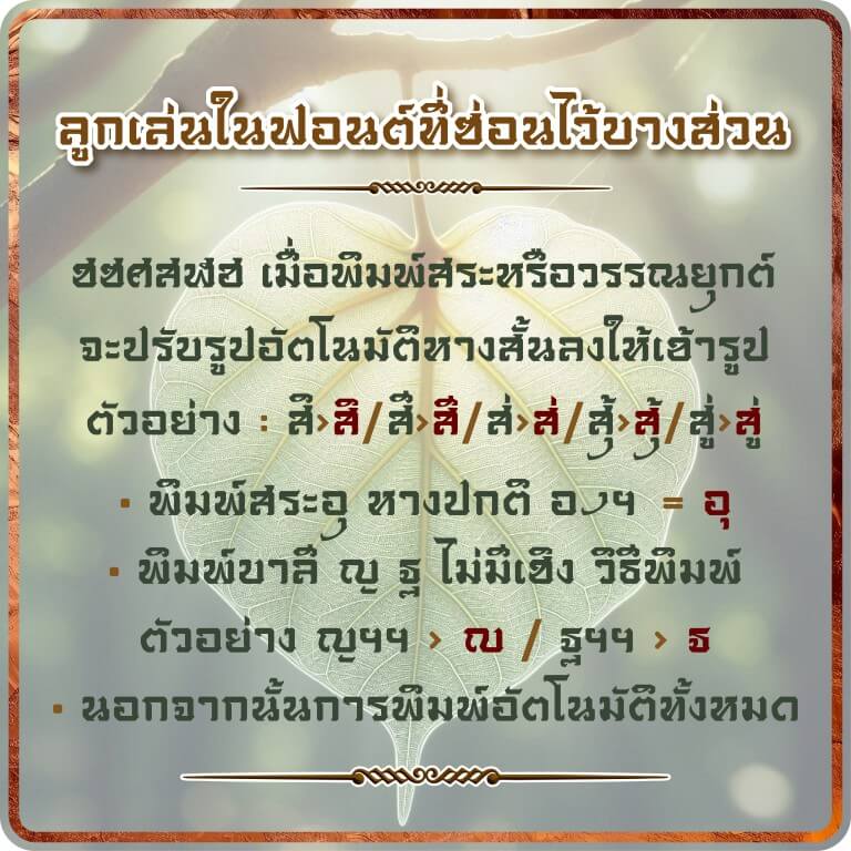 • ตัวอักษรมีหาปรับหางสั้นเองเมื่อพิมพ์  สระอิ อี อึ อื  ่   ้   ๊  ๋  ์   ็  ั  ํ