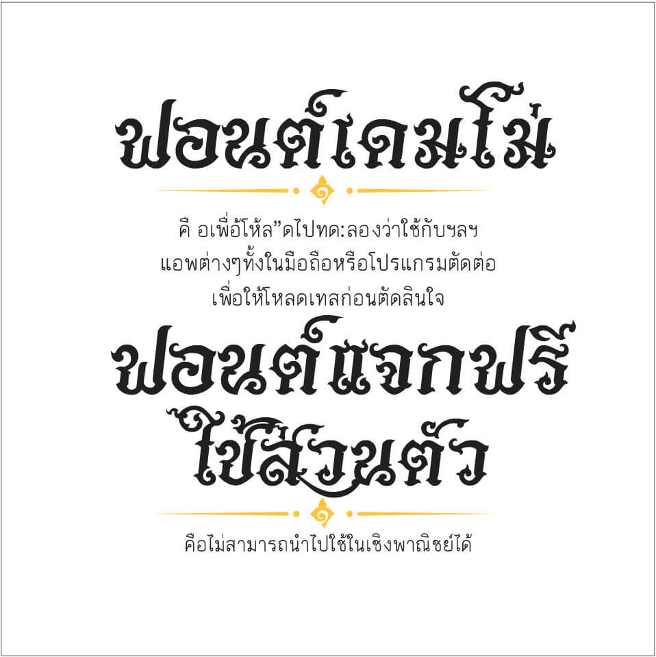 ฟอนต์ที่แจกฟรีนี้เป็นฟอนต์ทดลองใช้ (Demo) ครับ สามารถใช้ครอบคลุมหลายโปรแกรม โหลดไปทดลองกับไอแพด และแอนดรอยด์ดูก่อนได้