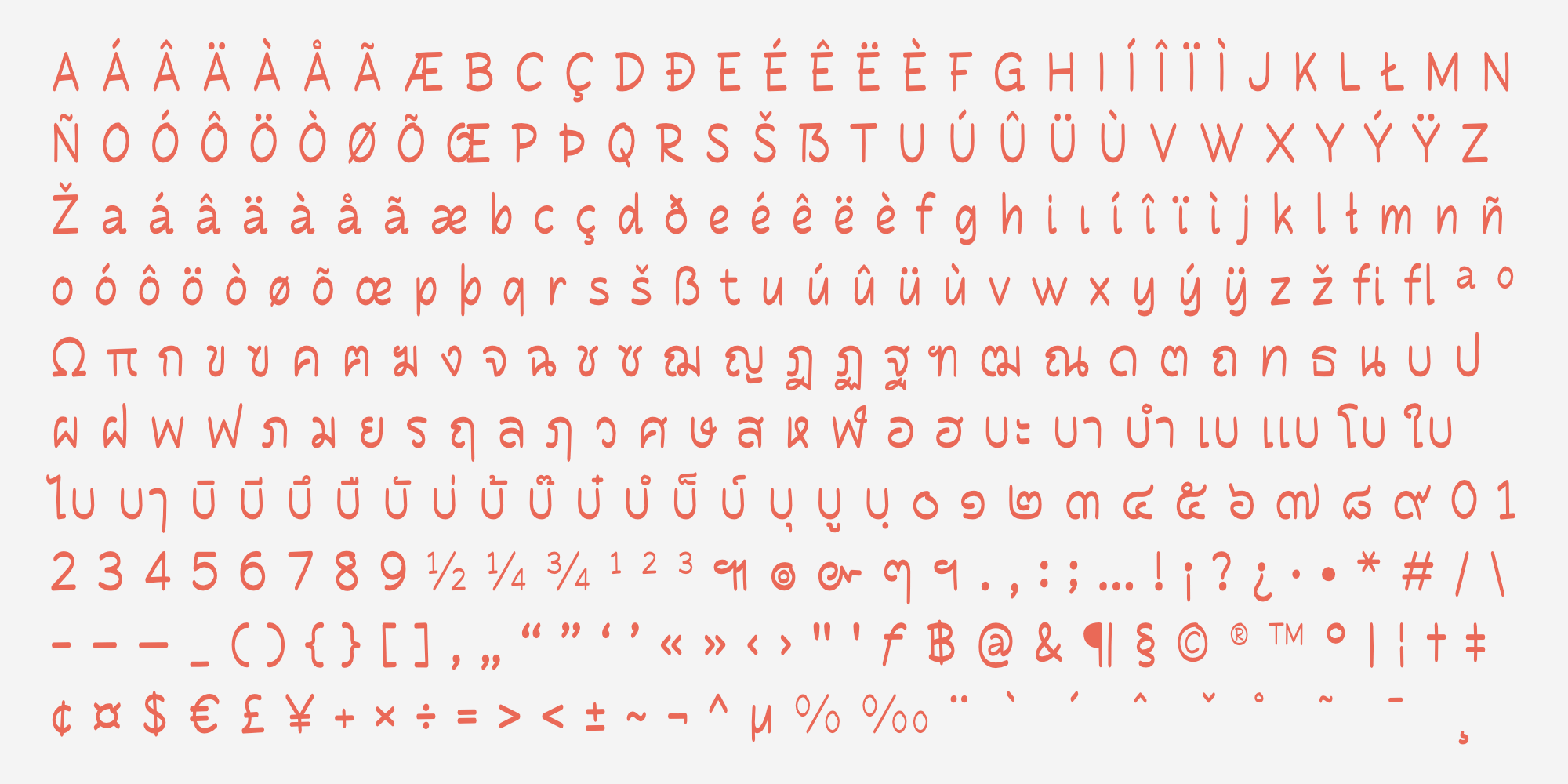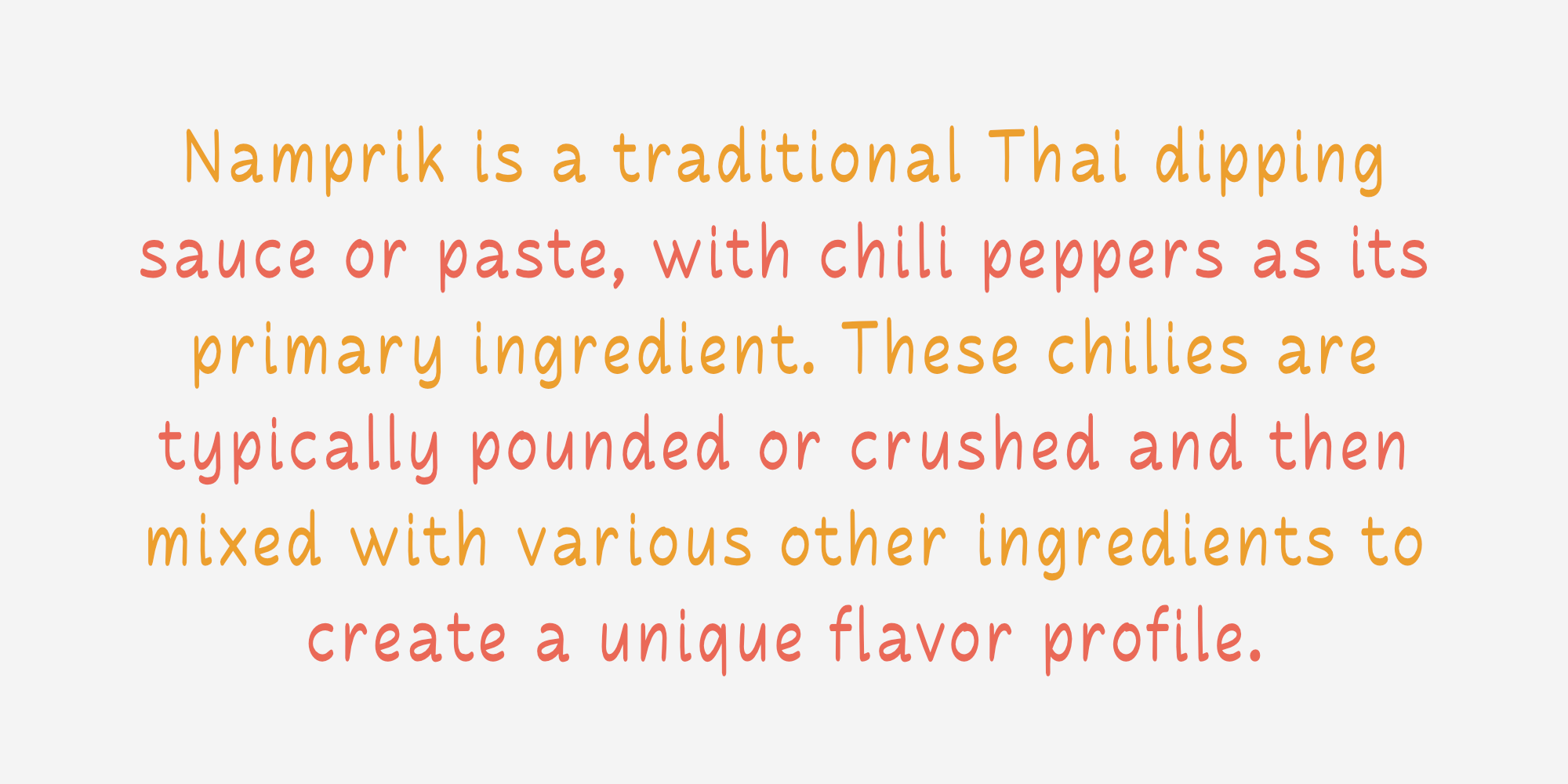 Namprik คือแบบอักษรสไตล์ลายมือที่โดดเด่นด้วยบุคลิกที่อบอุ่น เป็นกันเอง และดูขี้เล่นอย่างเป็นธรรมชาติ ตัวอักษรมีลักษณะเส้นโค้งมน ปลายเส้นมีความนุ่มนวลเสมือนเขียนด้วยปากกาเมจิก ให้ความรู้สึกที่ลื่นไหล ผ่อนคลาย และไม่เป็นทางการจนเกินไป แต่ยังคงไว้ซึ่งความอ่านง่ายสะอาดตา
