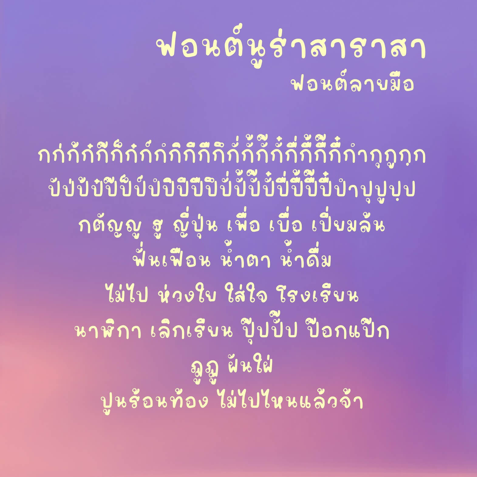 ฟอนต์ลายมือมีหัว มีด้วยกัน 3 น้ำหนัก คือ บาง ปกติ หนา นูร่าราดาเปิดให้ใช้ฟรีงานส่วนตัวและงานทั่วไป น้ำหนักบาง
