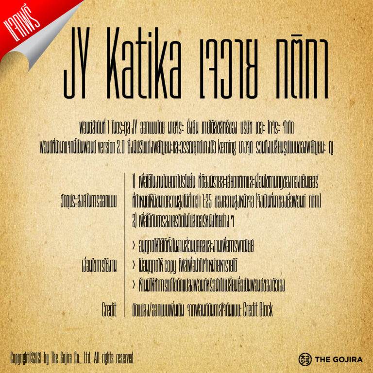 แจกฟรี ไม่จำกัดการใช้งาน – “JY Katika” อ่านว่า “เจวาย กติกา” ฟอนต์ลำดับที่ 1 ในตระกูล JY ออกแบบโดย นายจิระ ยั่งยืน ภายใต้ลิขสิทธิ์ของ บริษัท เดอะ โกจิระ จำกัด