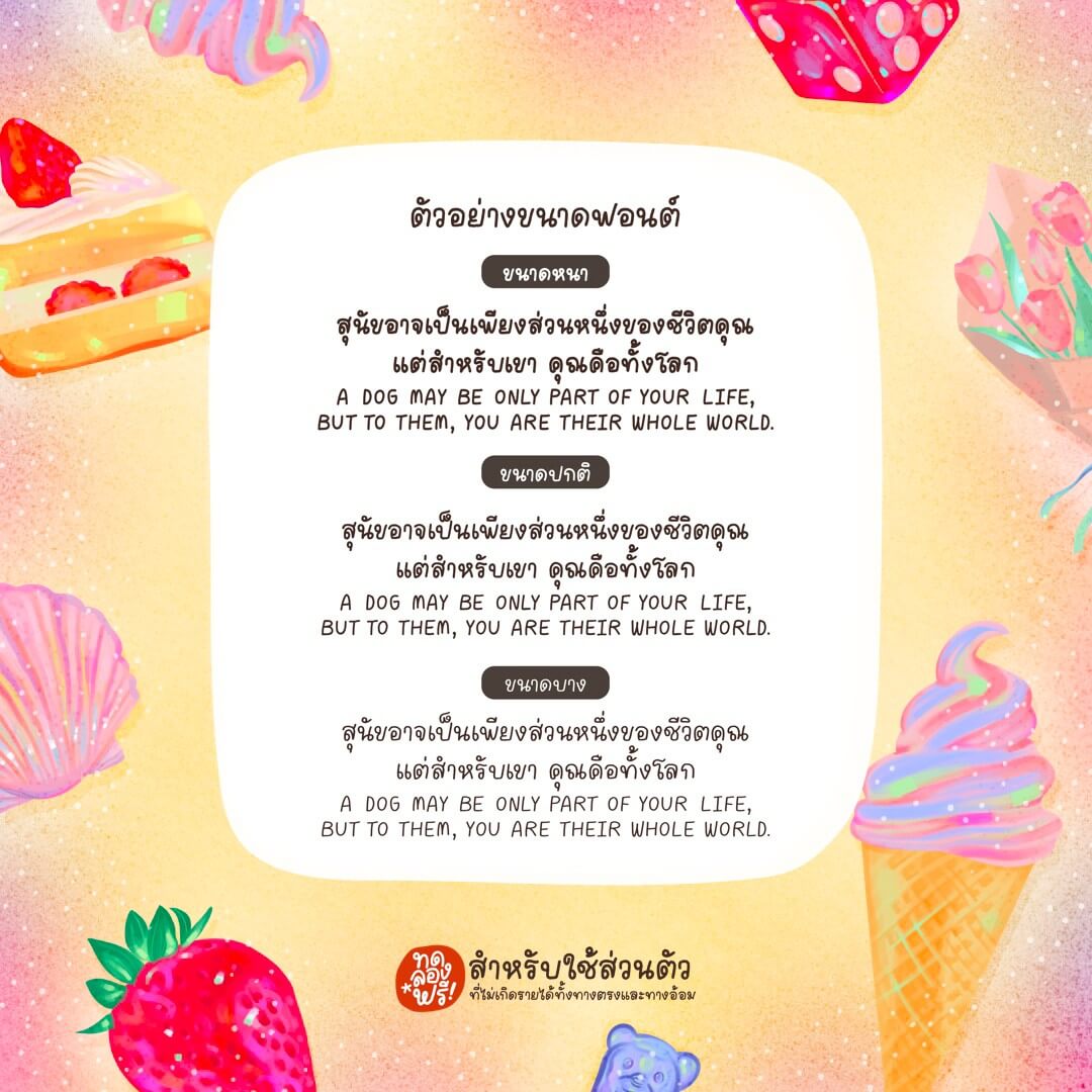 - สำหรับใช้งานส่วนตัวที่ไม่แสวงหาผลกำไรหรือผลประโยชน์จากการใช้ฟอนต์