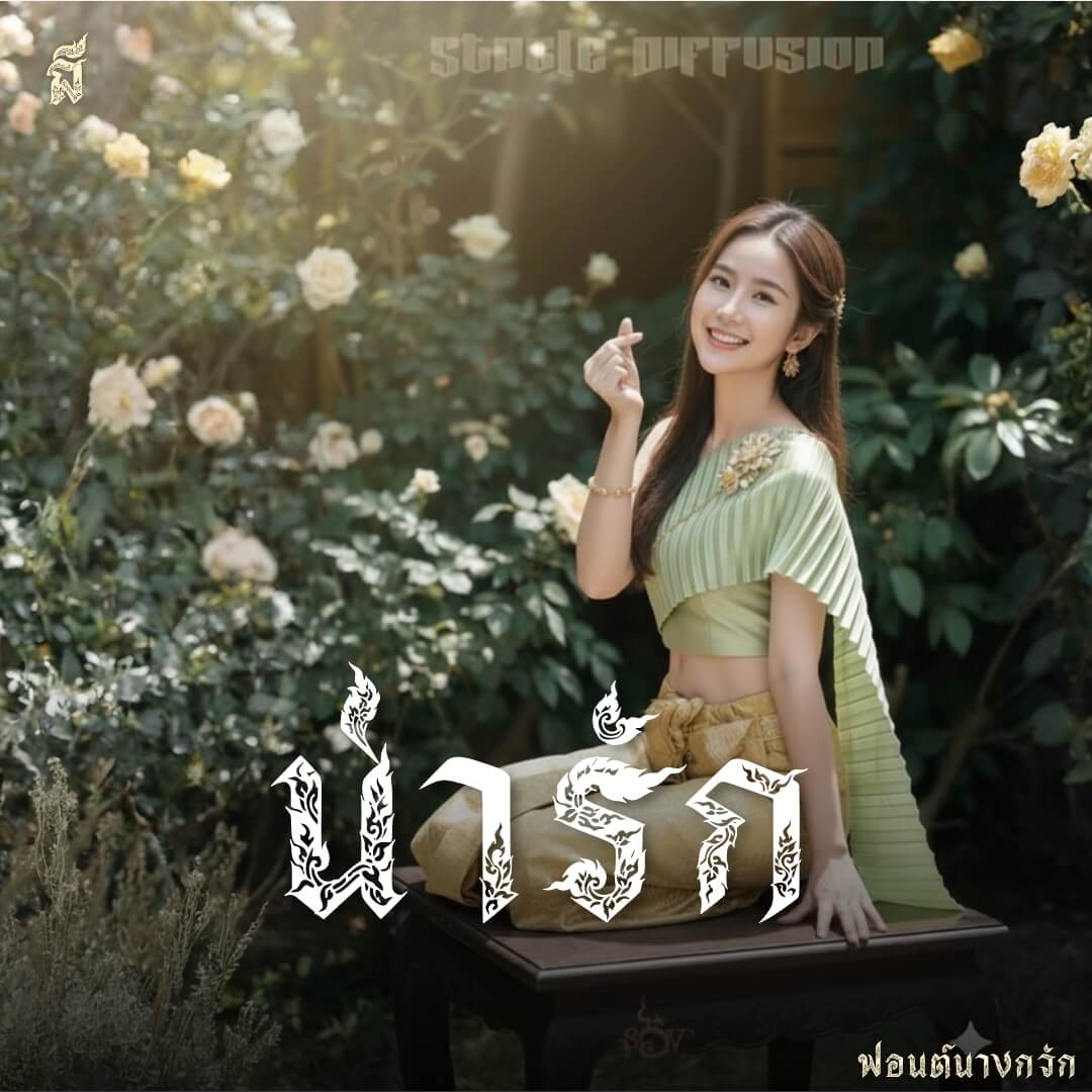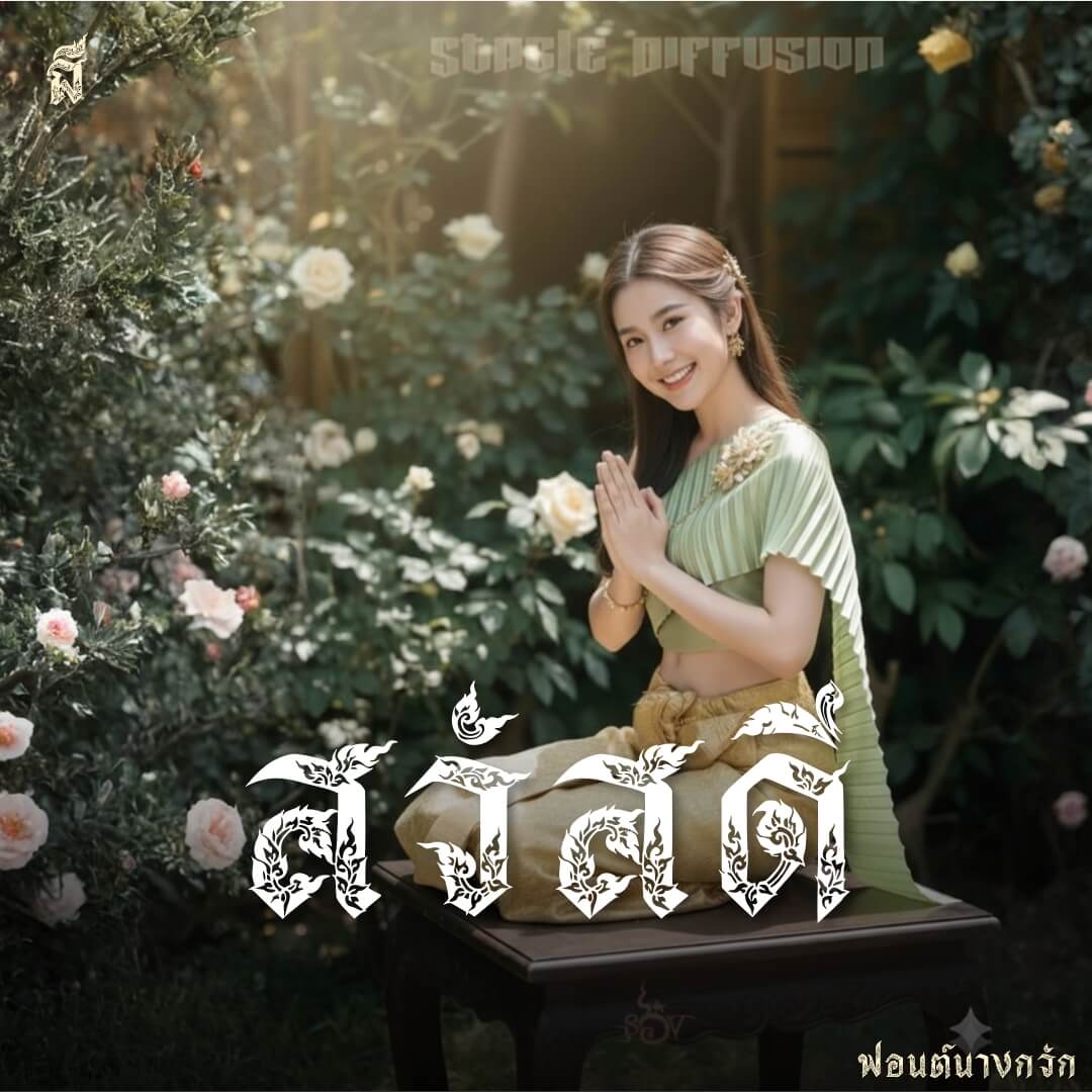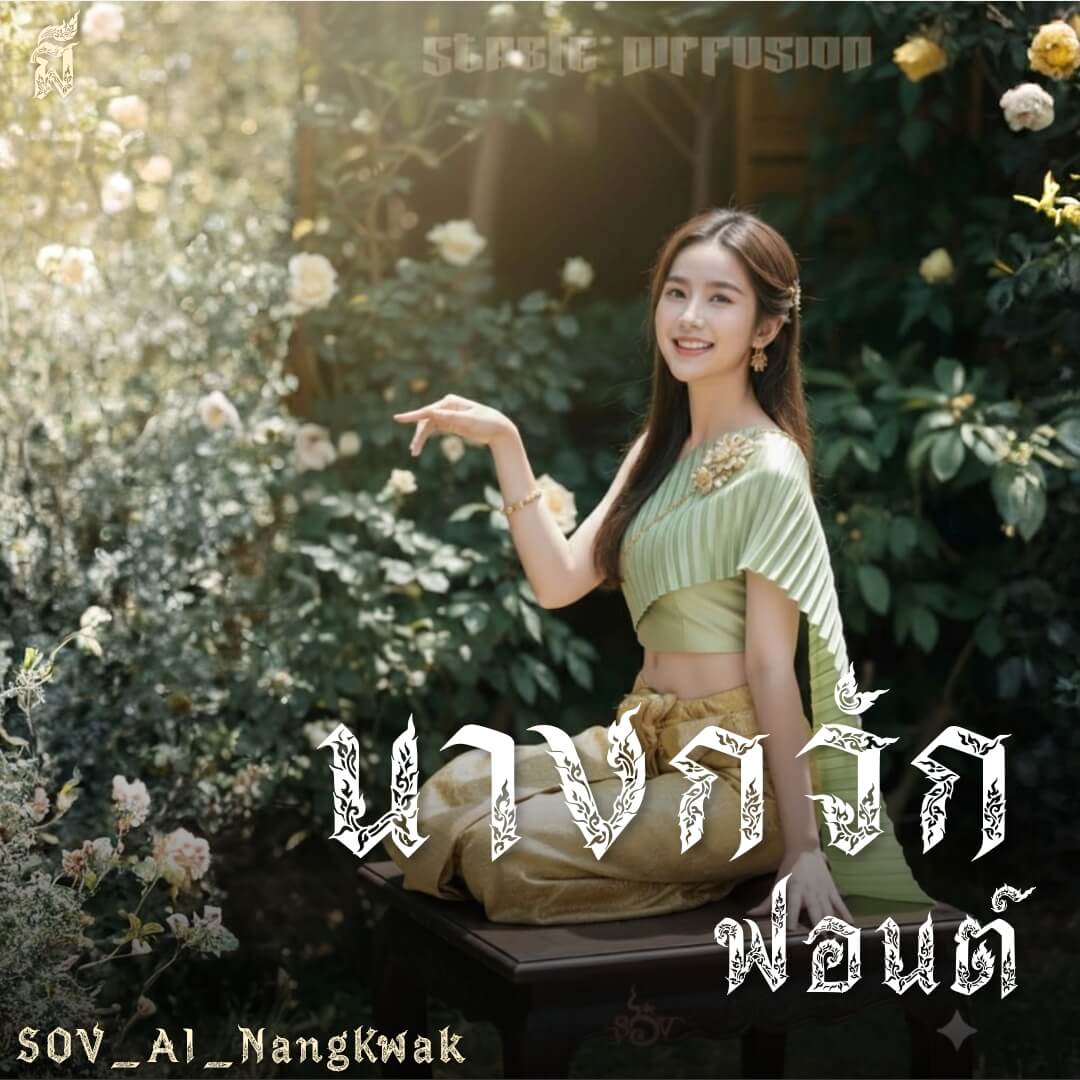 นางกวัก – ได้ชื่อมาจากคำชี้นำตอนที่ให้ AI gen รูปนางกวัก เป็นจังหวะที่ทดลองให้ AI ผสมลายกับฟอนต์ของเรา ..มั่วๆ จนได้รูปแบบอักษรเหลี่ยม ที่มีลายฉลุ และเส้นลายด้านนอก มารูปนึง ..จึงเอามาต่อยอด ทำเป็นตัวอักษรจนครบ