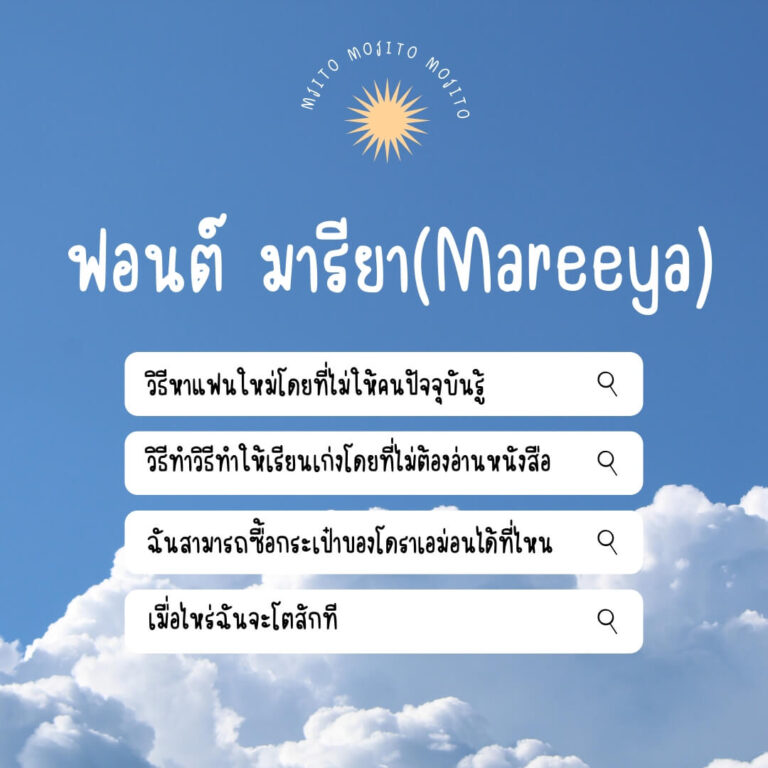 Mareeya (มารียา) ฟอนต์ที่มีเอกลักษณ์ ใช้ทำงานสไตล์น่ารักๆ จดโน้ต หรือจะทำแฟลชการ์ดก็ดูดี แจกฟรีไปเลยเวอร์ชันทดลอง : แบบปกติ 1 น้ำหนัก ใช้ได้เฉพาะแบบส่วนตัว เช่น ใช้ในการศึกษา ใช้จด ใช้ตกแต่งสมุดโน้ตตัวเอง