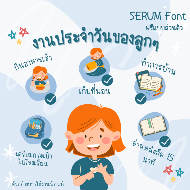 แรงบันดาลใจในการออกแบบ Serum : เป็นฟอนต์คลาสสิกที่มีความเป็นลายมือปนอยู่หน่อยๆ เหมาะกับการทำสไลด์ อธิบายสินค้าต่างๆ หรือพรรณนาเนื้อหายาวๆ เพราะอ่านง่ายเหมือนฟอนต์ทางการฉบับลายมือ และสระไม่ลอยทุกโปรแกรม